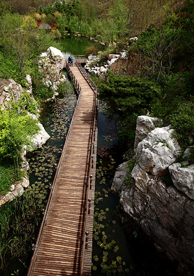 四大靜園位于北坡,分別名為彩徑觀花園、石林聽濤園、秀谷韻樂園和唱竹攬翠園,四個園子主題明確,景深豐富,個性分明,匠心獨具,一草一木別有風韻。其中,石林聽濤園位于公園西南側(cè),是一座秀美的古典園林,具有濃郁的江南水鄉(xiāng)特色,由紅梅、南天竹、臘梅等植物組成的漂亮花境,給人帶來賞心悅目之感;蜿蜒曲折的木棧道則連接起了園內(nèi)的汀步和園路,帶領(lǐng)游人去欣賞園內(nèi)的每一處美景。唱竹攬翠園位于公園中部,全園格局顯得緊湊自然,豐富的植物應(yīng)用,使得園內(nèi)一年四季景色各異,特別是剛竹、紫竹、鳳尾竹、湘妃竹、慈孝竹等竹子的應(yīng)用,更是呼應(yīng)園名,行走在園內(nèi),伴隨著陣陣清風徐來,讓人仿佛置身于“竹海聽濤”的悠閑意境中。