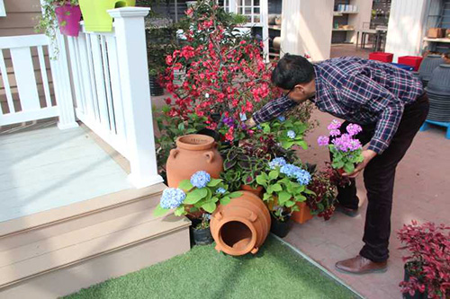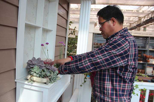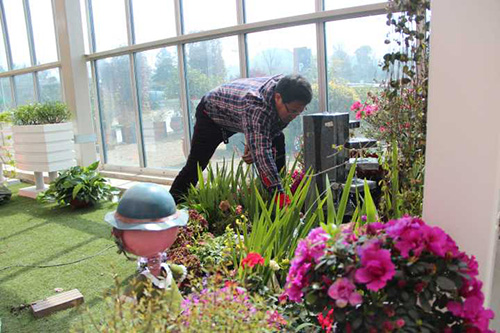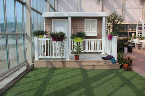 ▲我們選擇園藝中心室內(nèi)一處小木屋的陽(yáng)臺(tái),作為造景點(diǎn)。園藝師現(xiàn)場(chǎng)查勘后,初步確定花境布置點(diǎn)的面積和風(fēng)格。