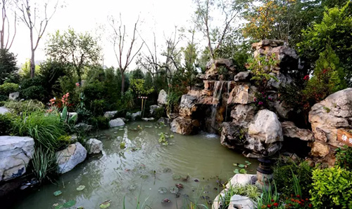 海綿城市是指城市能夠像海綿一樣,在適應(yīng)環(huán)境變化和應(yīng)對(duì)自然災(zāi)害等方面具有良好的“彈性”,下雨時(shí)吸水、蓄水、滲水、凈水,需要時(shí)將蓄存的水釋放并加以利用。展園內(nèi)采用碎石鋪就的“茶馬古道”,既能有限地補(bǔ)充地下水,又有一定的地表徑流削減作用。另外,園內(nèi)水池邊設(shè)置植被緩沖帶,通過(guò)植物攔截及土壤下滲作用有效減緩地表徑流流速,并去除徑流中的部分污染物,體現(xiàn)了海綿城市理念的截污凈化功能。