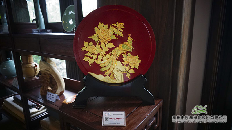 在浙江園的富春山居內(nèi),泥金彩漆、骨木鑲嵌、金銀彩繡等非遺展品也一并展出。泥金彩漆是寧波傳統(tǒng)的“三金”工藝之一,現(xiàn)主要分布于寧波市及其周邊地區(qū)。而骨木鑲嵌則是在木器表面嵌入動物骨骼進(jìn)行裝飾,也是寧波的一門特色手工藝。金銀彩繡則是在真絲面料上用各色彩線繡制、金線和銀線盤繡而成的漢族民間手工藝品之一。這些非遺展品展現(xiàn)了寧波深厚的文化底蘊(yùn)與人文精神。