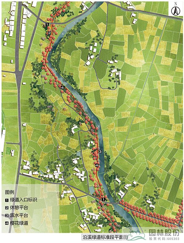 沿溪綠道為櫻花環(huán)中濱河段落,該標準段長度為730m,總長2590m。以春季櫻花為主題,打造浪漫的濱水慢行系統(tǒng),沿線打造休憩空間,設(shè)置休憩設(shè)施,并在入口處設(shè)計特色標識,成為村民通行休閑健身的浪漫步道。