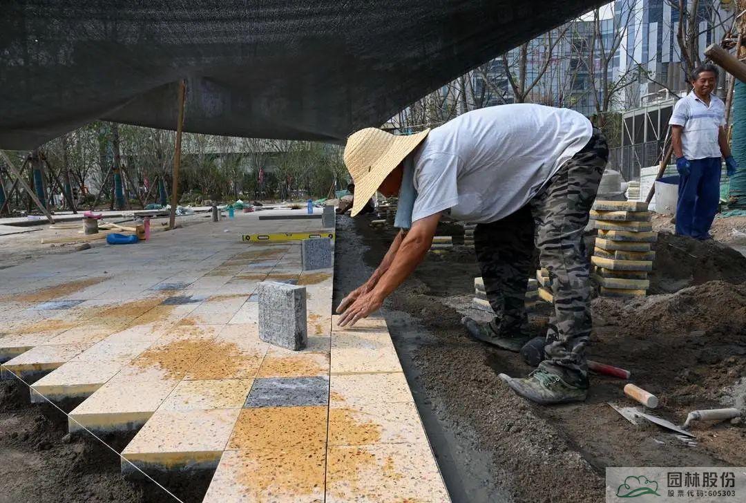 工人進(jìn)行道板鋪設(shè)。