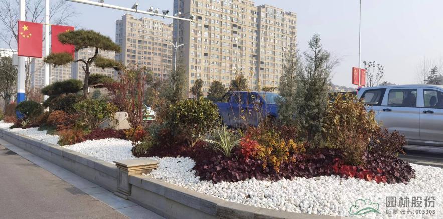 在江山大道與黃山路、黃浦江路與項王路路口在植物配置上,采用群落結(jié)構(gòu)、組團配置和盆景化的自然式造園手法,在空間、色彩、節(jié)奏方面獨具匠心,打造了高低錯落、疏密有致的和諧景觀??紤]到行車安全性與視線誘導因素。考慮到行車安全性與視線誘導因素,中央綠化隔離帶以黑松樁的種植片段和花鏡+球類的自然群落片段進行循環(huán),打造規(guī)則中有自然的效果。機非綠化隔離帶以黑松樁+花鏡種植,打造艷麗的春景效果。