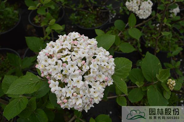 忍冬科莢蒾屬,落葉灌木,株高3-4.5 m,為瓊花和紅蕾莢蒾的雜交種。葉片較厚,較大,到秋季變成酒紅、橙紅或紫色色調(diào)。聚傘花序花蕾粉紅色,開放后白色,聚集似小雪球,具芳香,花徑8-14cm,花期3-4月。喜光,半陰環(huán)境也生長良好,生長速度中等;擇土不嚴,微酸性、中性至微堿性土壤均可生長,尤喜濕潤、排水良好的富含有機質(zhì)土壤;抗寒性強;耐修剪,適合自然風格的工程應(yīng)用或庭院觀賞。