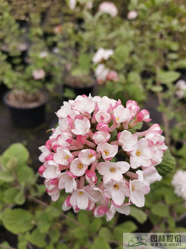忍冬科莢蒾屬,半常綠或常綠灌木,株高2-3 m,為紅蕾莢蒾和煙管莢蒾的雜交種。葉色深綠,秋季轉(zhuǎn)紅,顏色程度因所處地區(qū)而異。該種繼承了紅蕾莢蒾粉花的優(yōu)良基因,花序未開放時呈現(xiàn)靚麗的粉色,開放后白色,且具有較濃郁的花香?;◤揭话?.5-10 cm,花期3-4月。植株具有良好的頂端優(yōu)勢,枝條年生長量大,但分枝能力稍弱。幾乎無病蟲害。適應(yīng)性強,生長速度快,耐干旱且耐寒,適合自然風格的工程應(yīng)用或庭院觀賞。
